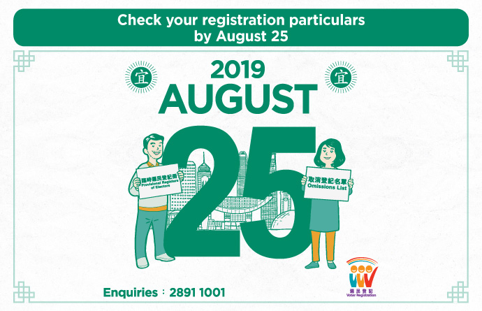 The provisional register and the cancellation list were published today (August 1) for public inspection until August 25. The Registration and Electoral Office appeals to members of the public to check their latest registration information and check whether they are included in the deregistration list on the "Electoral Information Online Access System" (www.voterinfo.gov.hk). The public can also call the Registration and Electoral Office hotline (2891 1001) during office hours to enquire about the above information.